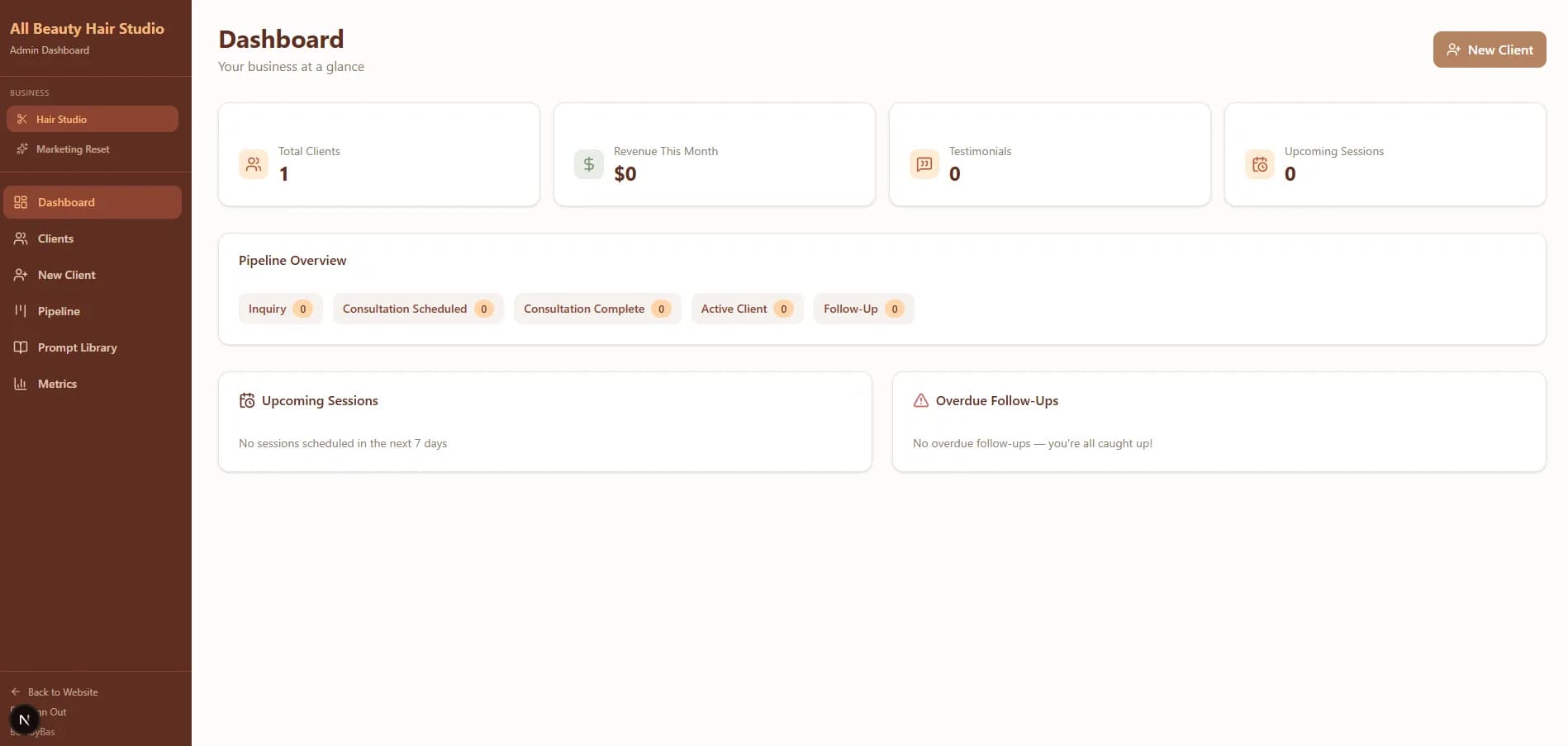 - Admin CRM dashboard with live metrics: total clients, revenue, testimonials, upcoming sessions