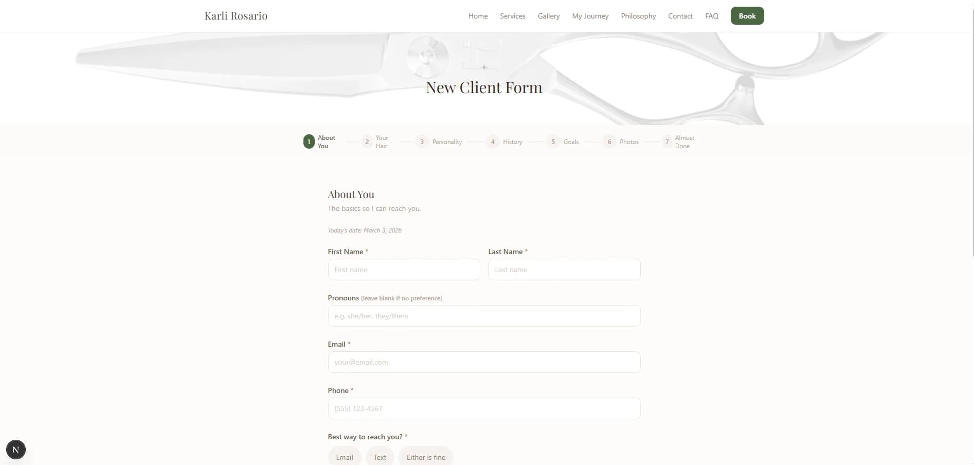 - 7-step new client intake form: About You, Your Hair, Personality, History, Goals, Photos, Review