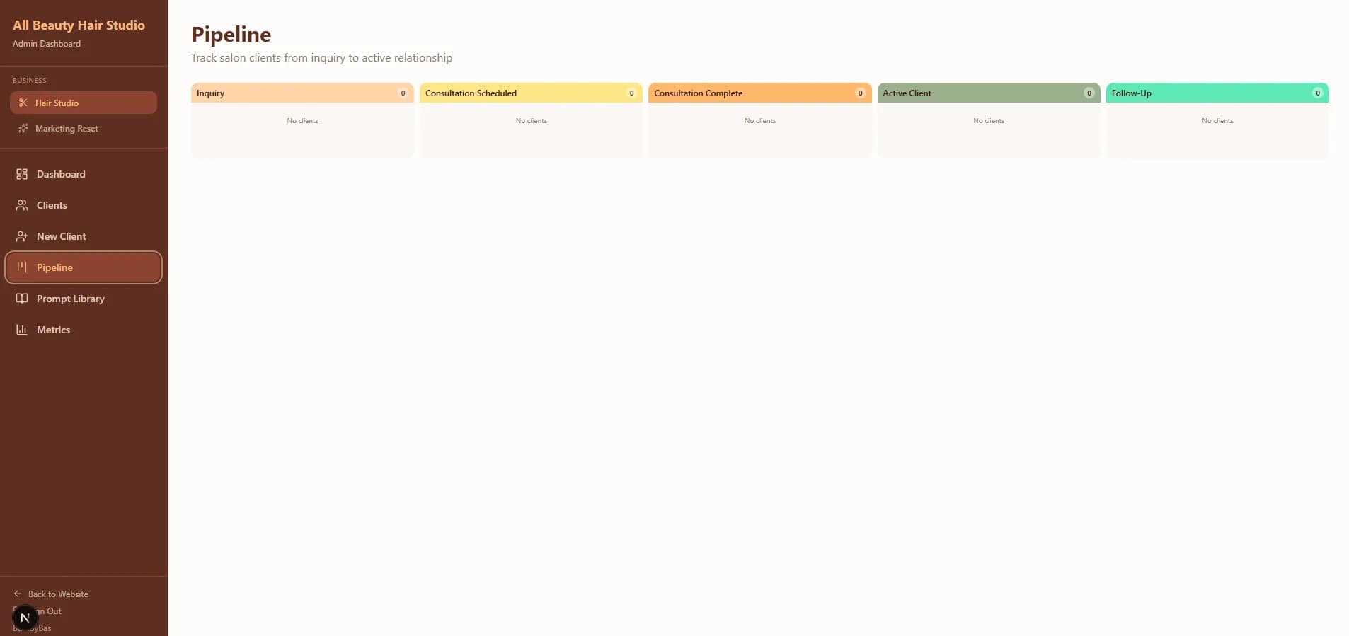 - Kanban pipeline: Inquiry → Consultation Scheduled → Consultation Complete → Active Client → Follow-Up