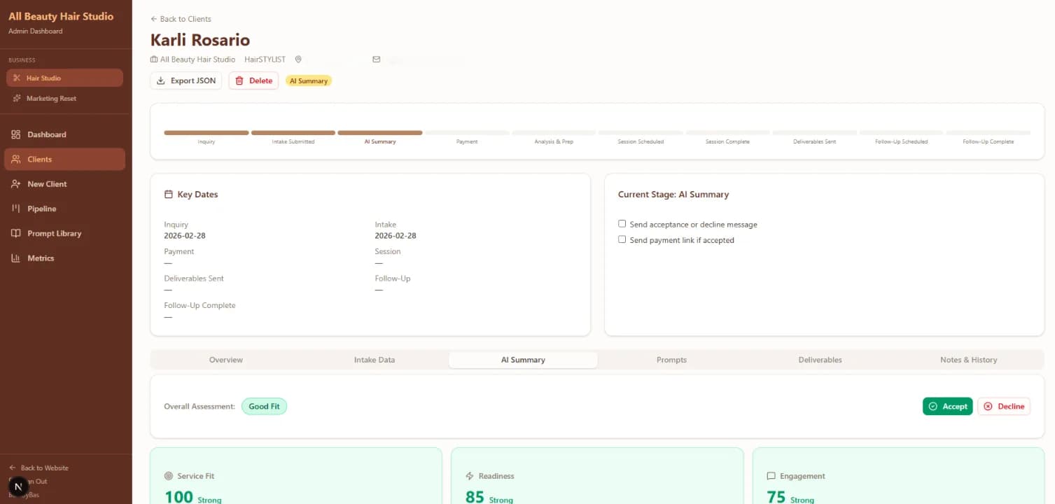 What she got: a complete business platform in two parts. On the front - a personal brand site that leads with her voice: 'I design hair that works with your life.' Her journey from performer to stylist, her philosophy, her client relationships - all front and center. A 7-step intake form qualifies every new client before they ever book, collecting hair history, personality, goals, and reference photos so Karli arrives at every consultation already prepared. On the back - a full CRM: real-time dashboard, kanban pipeline from inquiry to follow-up, AI-generated fit scores (Service Fit, Readiness, Engagement), and a 10-stage client journey tracker with key dates logged at every milestone. Multi-business support means the same system expands to Marketing Reset without a new build. She went from notebook to command center.