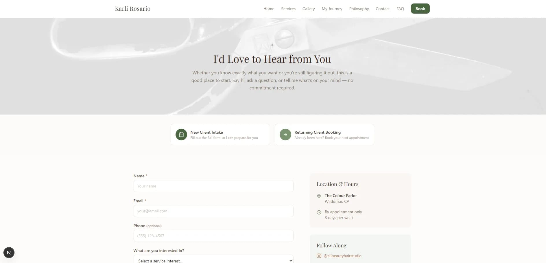 What she had: a generic Wix template that looked like every other salon online, a clunky booking flow, and zero backend. Inquiries came in through a basic contact form and were managed in a notebook. There was no intake process, no pipeline, no way to see revenue or client status at a glance. The site buried her story - her journey from performer to stylist, her philosophy, her approach to client relationships. None of it showed up. She was paying monthly Wix fees for a site that actively undersold her.